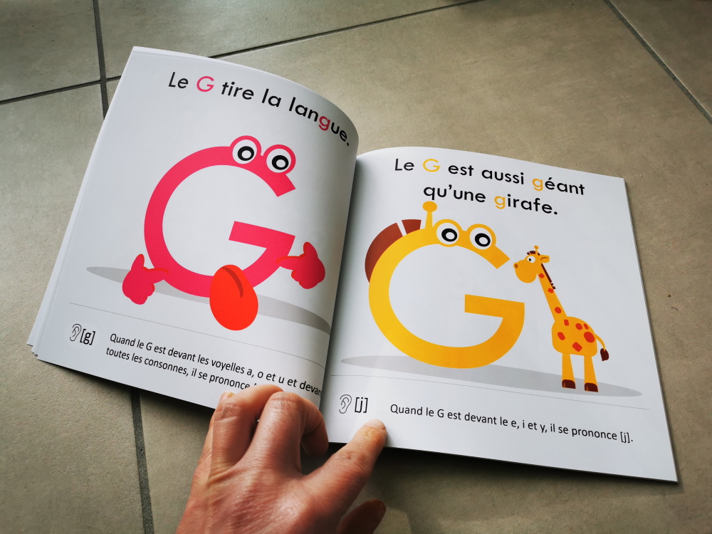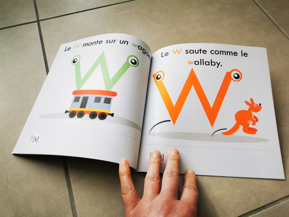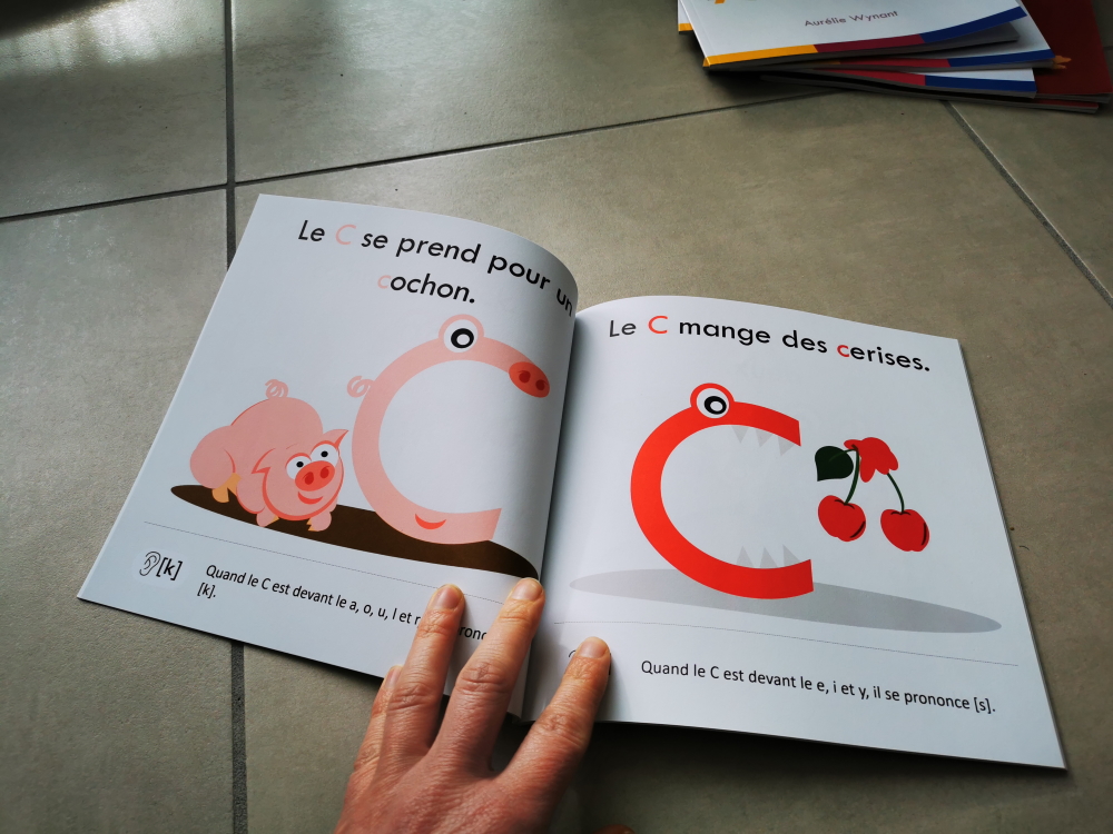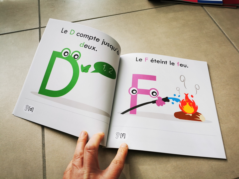 L’enfant apprend le son des lettres grâce à des illustrations colorées mettant en action chaque lettre à l’aide d’une phrase courte contenant le son de la lettre.