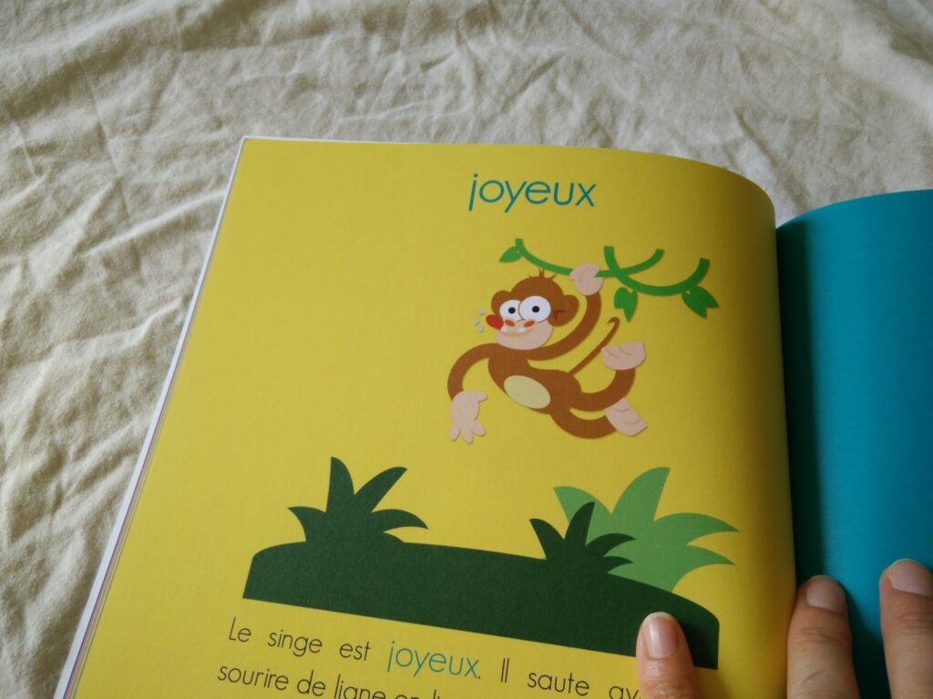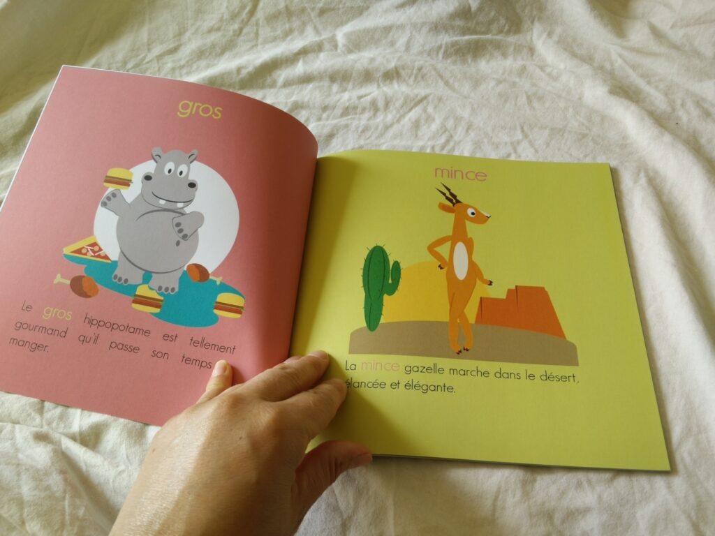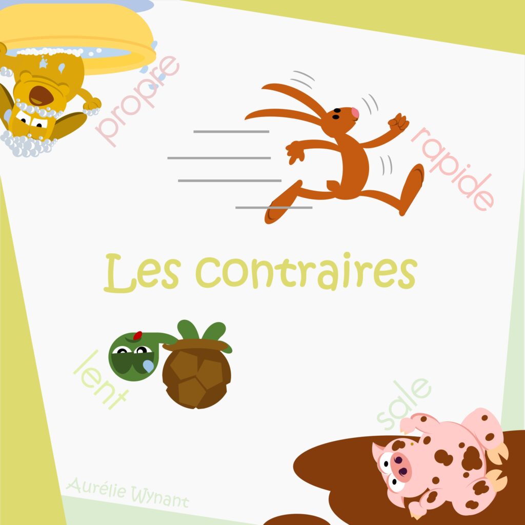 Grâce à cet imagier et ses nombreux animaux, l’enfant apprend les contraires et découvre de nombreux adjectifs et mots : grand / petit, long / court, gros / mince, rapide / lent, joyeux / triste, à l’endroit / à l’envers, dans / en dehors, sur / sous, jour / nuit, allumé / éteint, en cage / en liberté, lourd / léger, propre / sale, …