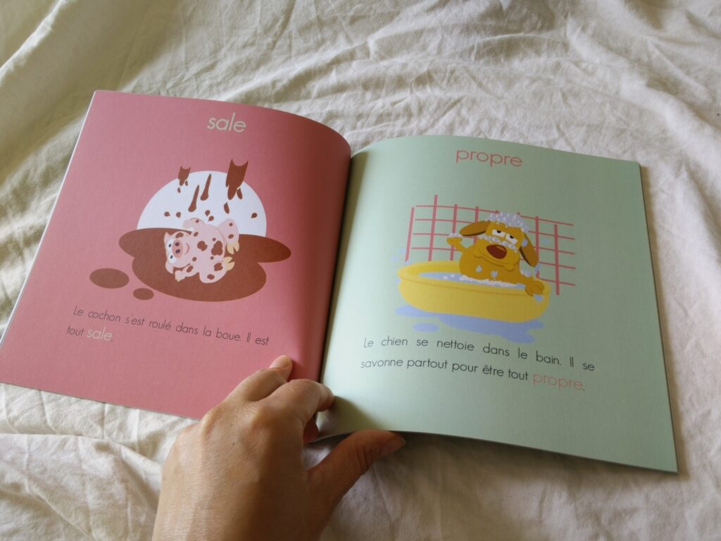 Livre jeunesse : L’enfant apprend et découvre les contraires à l’aide des animaux.