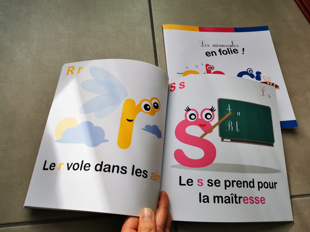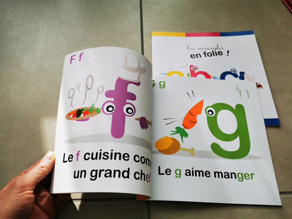 L’enfant apprend les lettres minuscules grâce à des illustrations colorées mettant en action chaque lettre à l’aide d’une phrase courte contenant le nom de la lettre.