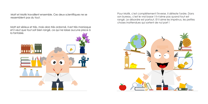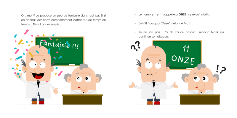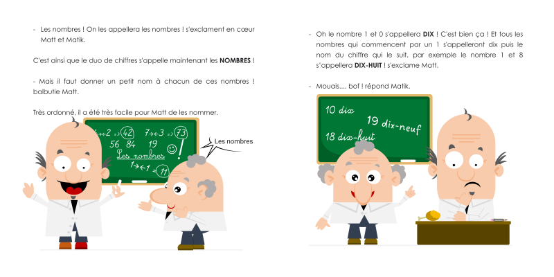 Matt et Matik, deux scientifiques passionnés par les chiffres, ont nommés chaque nombre à deux chiffres. Malheureusement Matik, qui aime le désordre, a décidé de donner des noms inattendus pour certains nombres. Oui, oui ! onze, douze, treize, … c’est son idée. Et il en a eu d’autres !