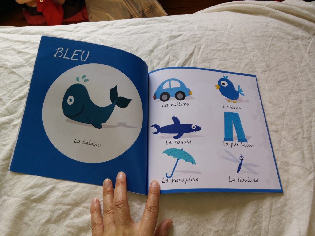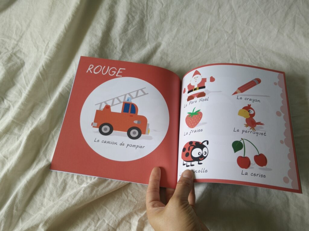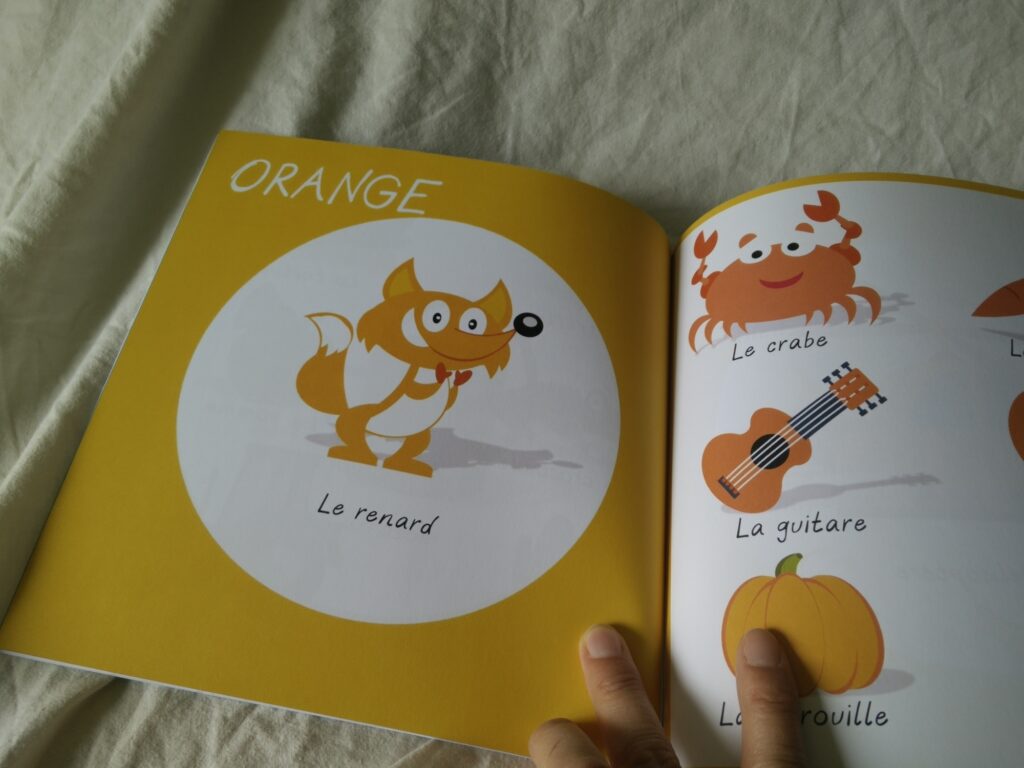 L’enfant découvre 11 couleurs : bleu, rouge, vert, jaune, orange, rose, violet, marron, gris, noir, blanc.