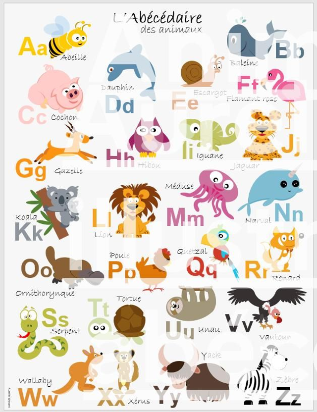 Poster de l’abécédaire illustré des animaux avec affichage des lettres majuscules et des lettres minuscules.