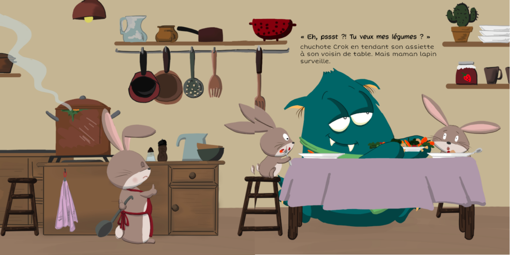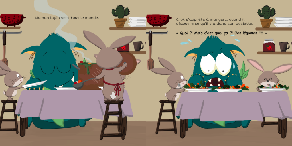 Attiré par une agréable odeur sortant de la maison de la famille lapin, Crok est invité à manger. Il est impatient de goûter le plat cuisiné par maman lapin, jusqu’à ce qu’il découvre ce qu’il y a dans son assiette : des LEGUMES ! Oh non ! Pas des légumes !